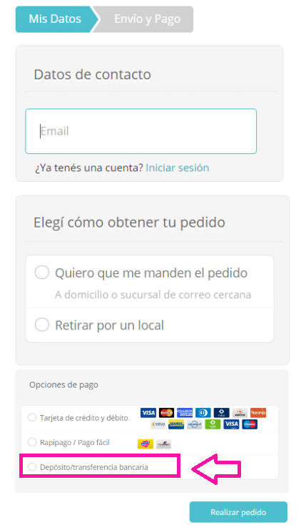5- Por último, elegí la forma de pago de depósito transferencia. *NO VÁLIDO PARA MERCADO PAGO.